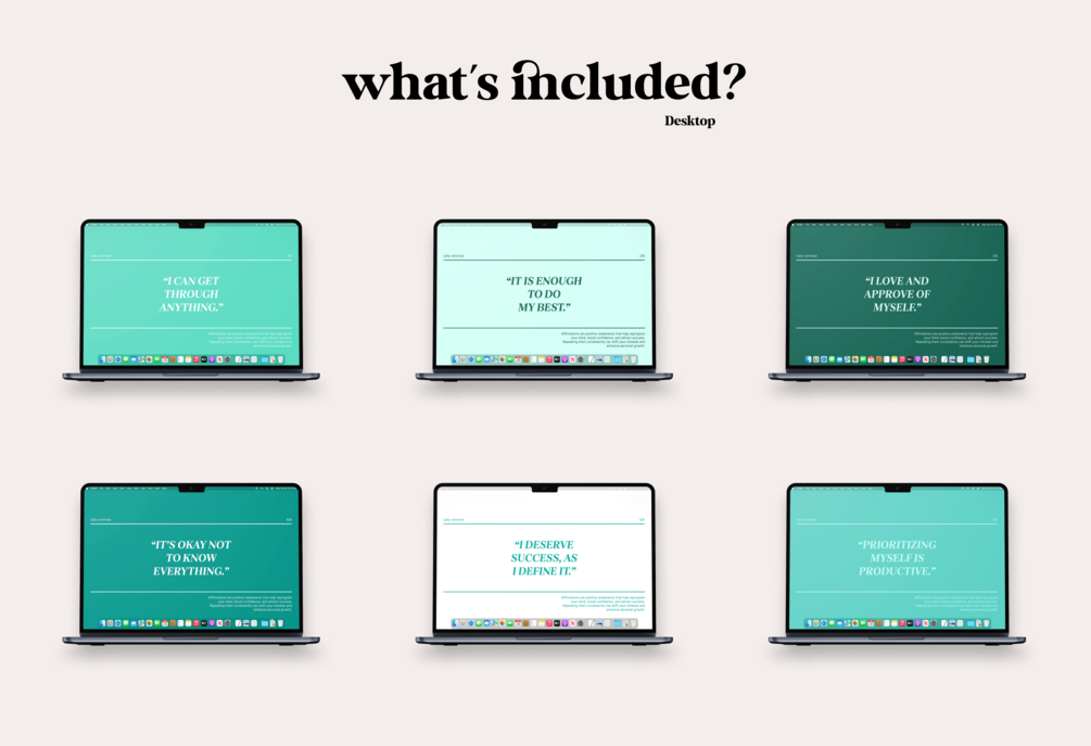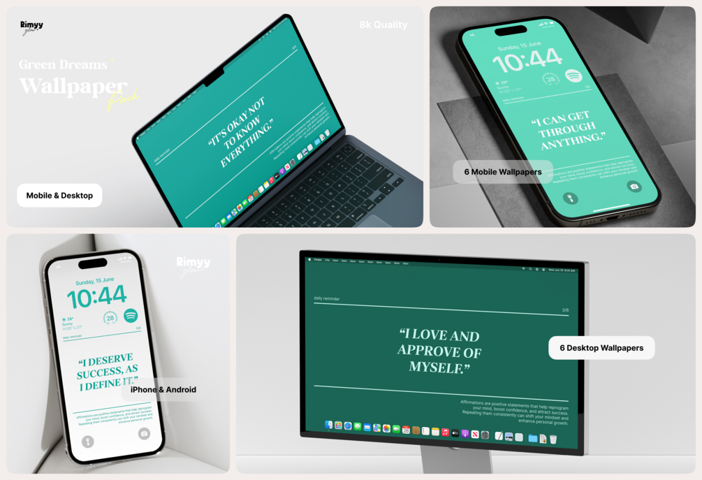 Featuring 6 sleek, luxurious wallpapers for mobile and 6 for desktop, each design pairs soothing green tones with powerful affirmations to inspire balance, growth, and inner peace.