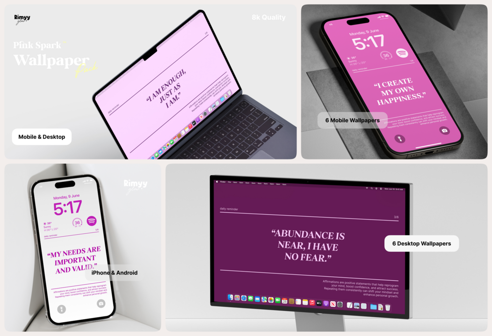 Pink Spark™ is a premium affirmation wallpaper pack designed to ignite your confidence and elevate your digital space.